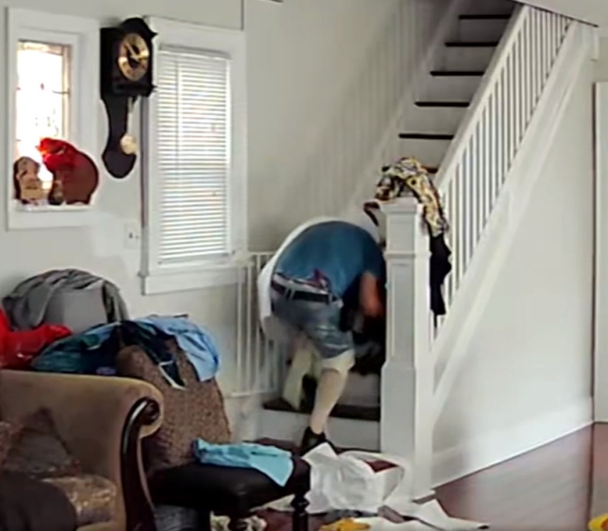 It showed the suspect go up the steps to the second floor of the home and then come down about an hour later. He pulls out a walkie talkie and says what sounds like, "Tony, Tony, Tony, Tony."